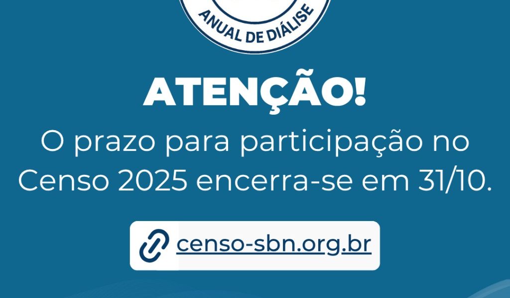 O prazo se encerra em 31/10. Não perca a oportunidade de enviar os dados da sua unidade e contribuir para a melhoria do tratamento de pacientes com Doença Renal Crônica em todo o país. Faça sua parte e fortaleça a nefrologia brasileira! 🔗 www.censo-sbn.org.br 📩 Em caso de dúvidas: [email protected]