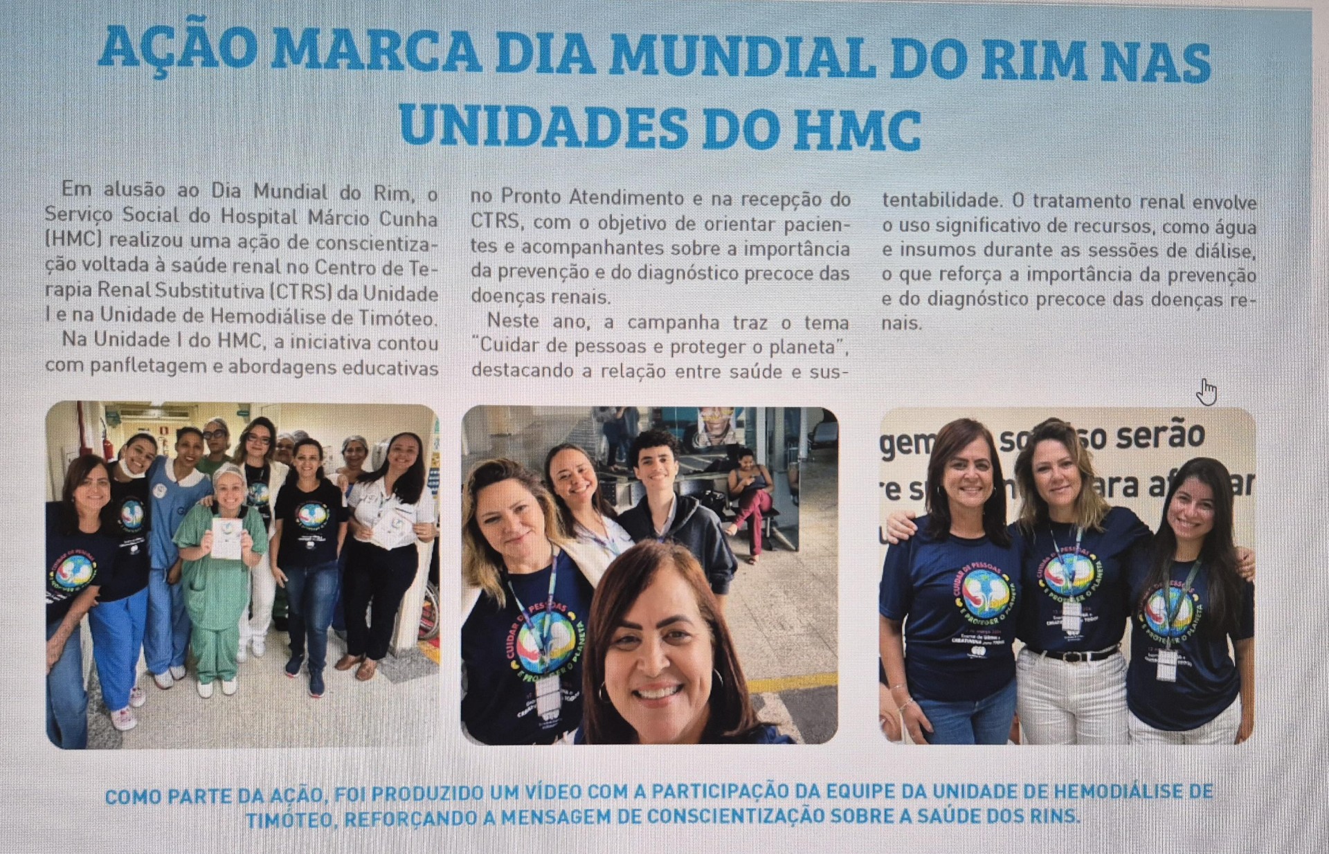 A proposta reforça que a saúde renal está diretamente relacionada à qualidade de vida, aos hábitos saudáveis e também à responsabilidade em cuidar de nossa saúde e do nosso planeta! Essa equipe é comprometida muito orgulho em fazer parte , todos os anos temos a satisfação em participar incentivando ações de prevenção, conscientização, acesso ao tratamento e nesse ano um alerta importante à redução de riscos ambientais.