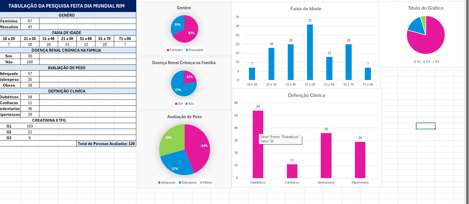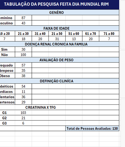 REALIZAMOS EXAME DE CREATININA EM 130 PESSOAS , RODA DE CONVERSA, BLITZ NA RUA ORIENTANDO SOBRE CUIDADO COM O RIM