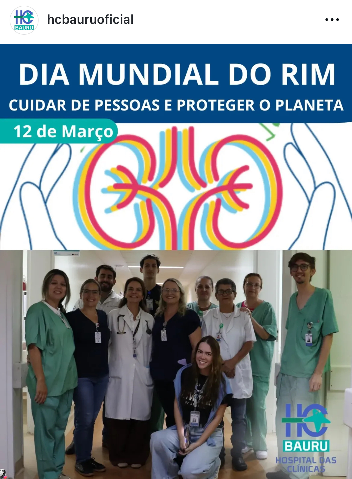 Evento realizado no anfiteatro do Centrinho, no complexo hospitalar do Hospital das clinicas de Bauru e contou com médicos, enfermeiros, técnicos de enfermagem, fisioterapeutas, médicos residentes. Dentre as atividades destacamos a palestras, distribuição de cartazes, panfletos, 100 mini vasos de suculentas e plantio de um Ipê branco com placa em homenagem ao dia mundial do rim de 2026.