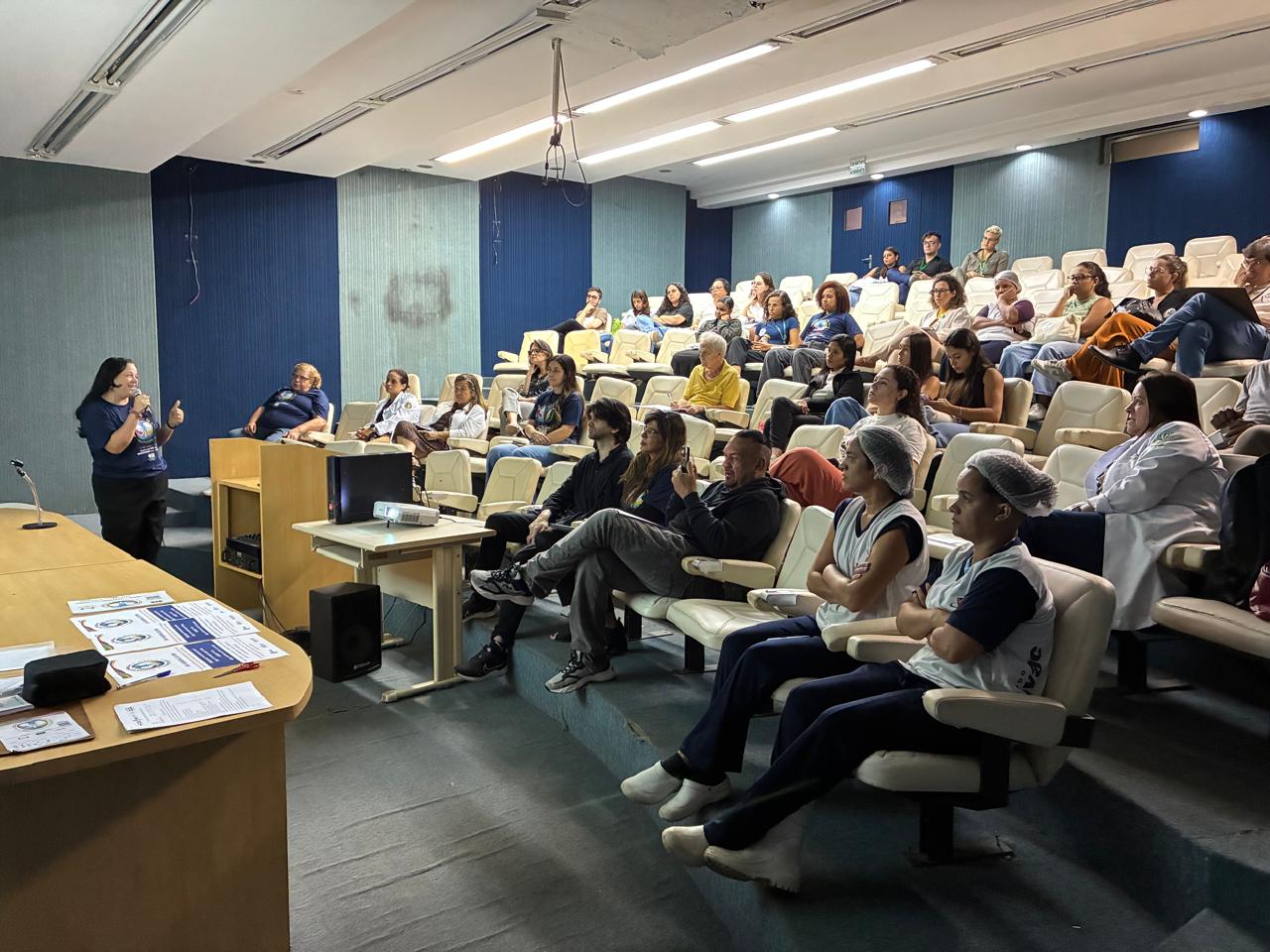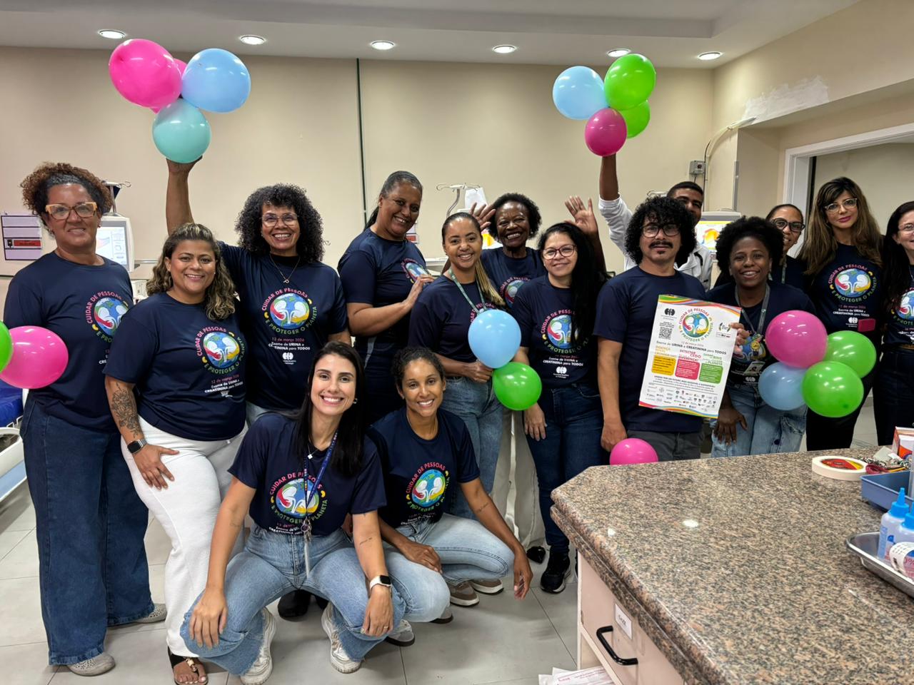 A equipe multidisciplinar da Nefrologia – enfermeiros, médicos e nutricionistas – realizou ciclo de palestras sobre prevenção da Doença Renal, além de triagem dos fatores de risco. Os funcionários que apresentaram score elevado foram encaminhados para realizar exame de creatinina e urina, com posterior acompanhamento. Além disto, verificamos pressão arterial, cálculo de IMC, orientações gerais sobre prevenção da doença renal e oferecemos um lanche saudável, enfatizando a importância de bons hábitos alimentares. Atendemos cerca de 70 funcionários do HUCFF/UFRJ, principalmente dos setores administrativos.