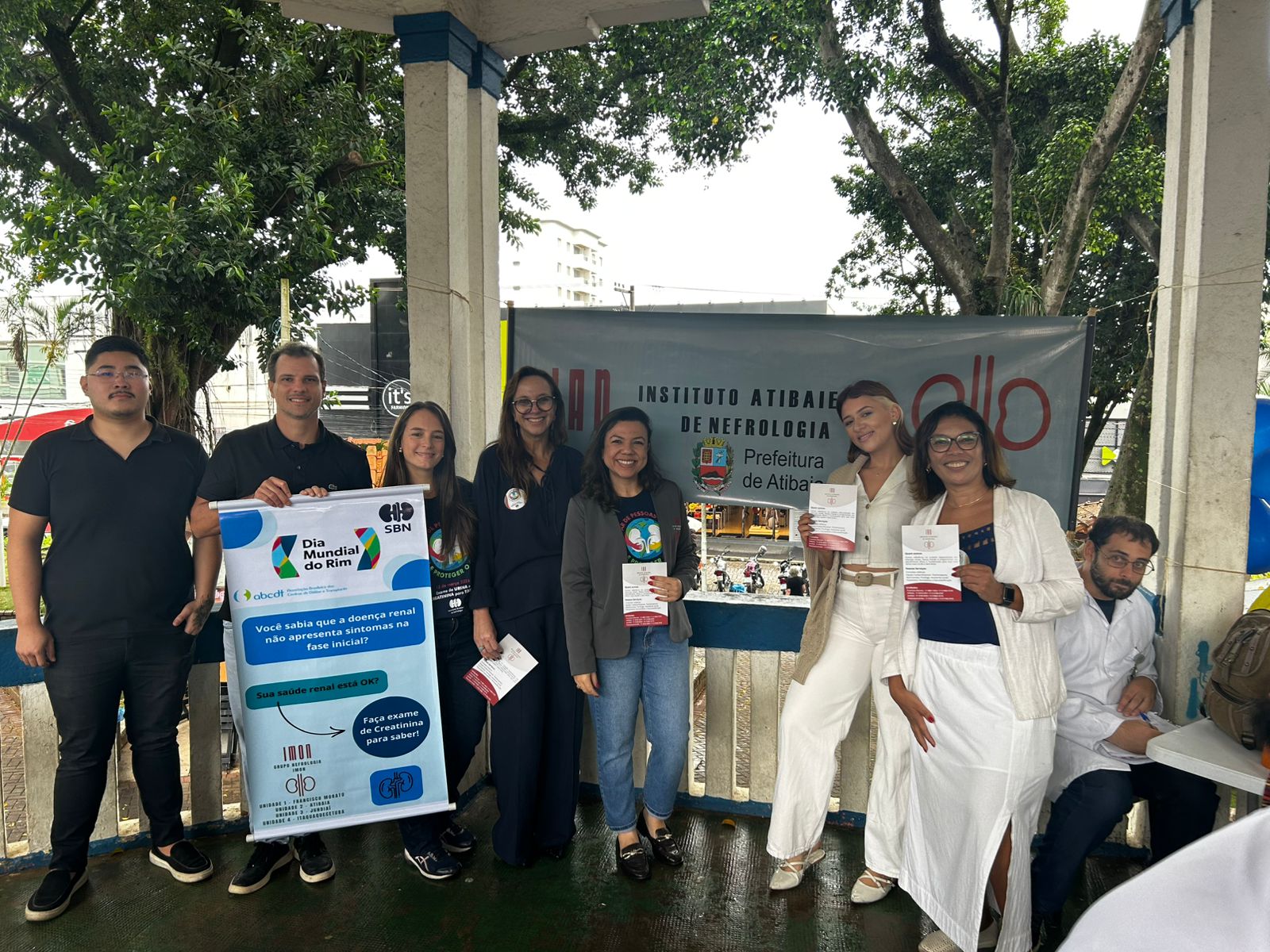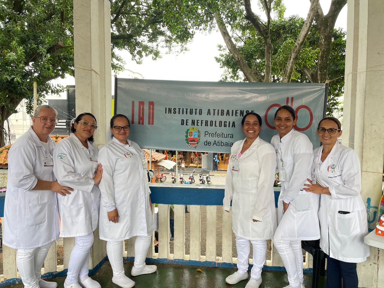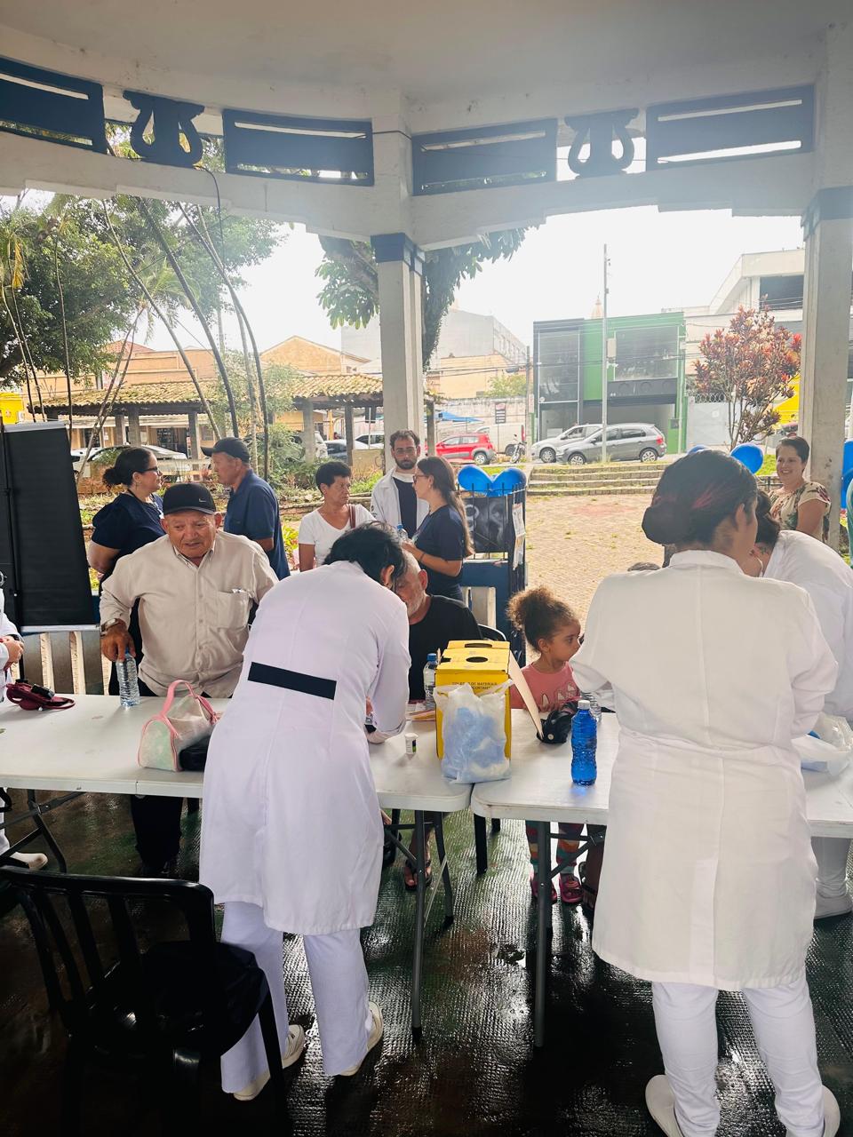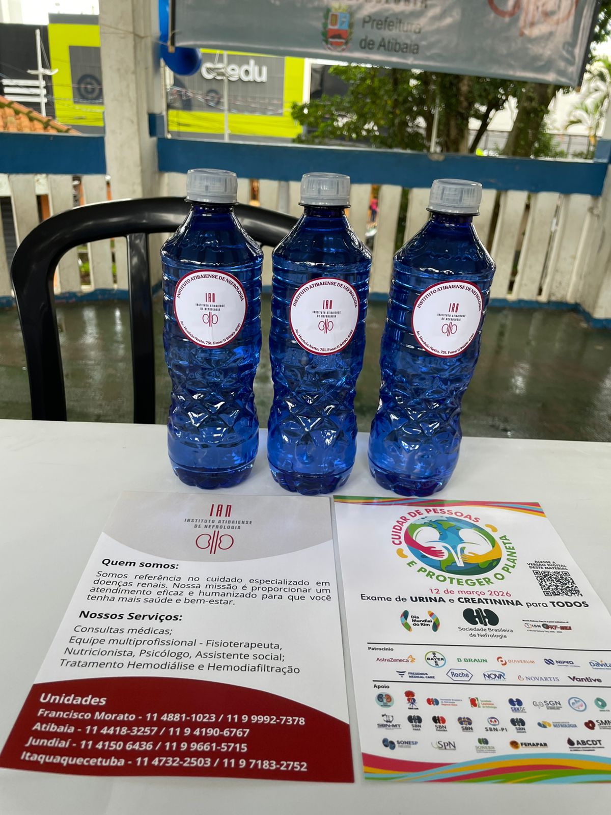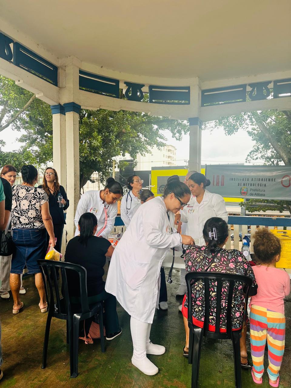 Atendemos mais de 100 pessoas na praça central de Atibaia, na qual realizamos teste de glicemia capilar, verificação de pressão arterial, informações sobre saúde renal e distribuição de garrafas de água.