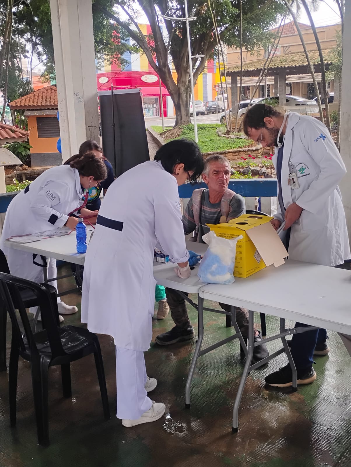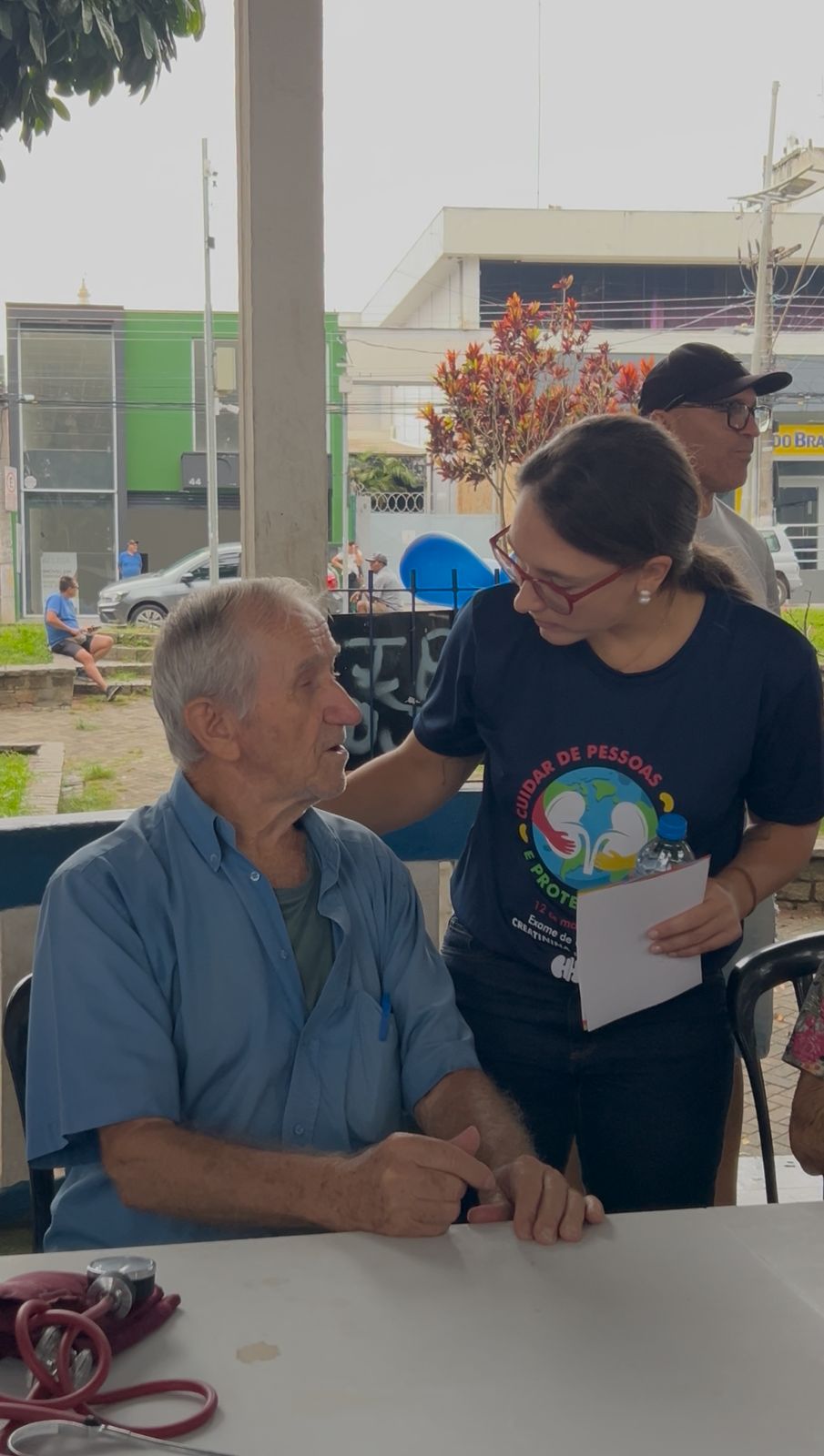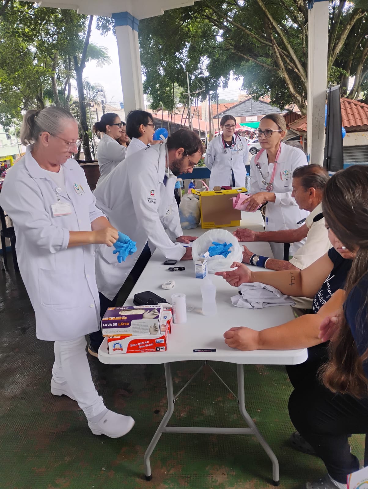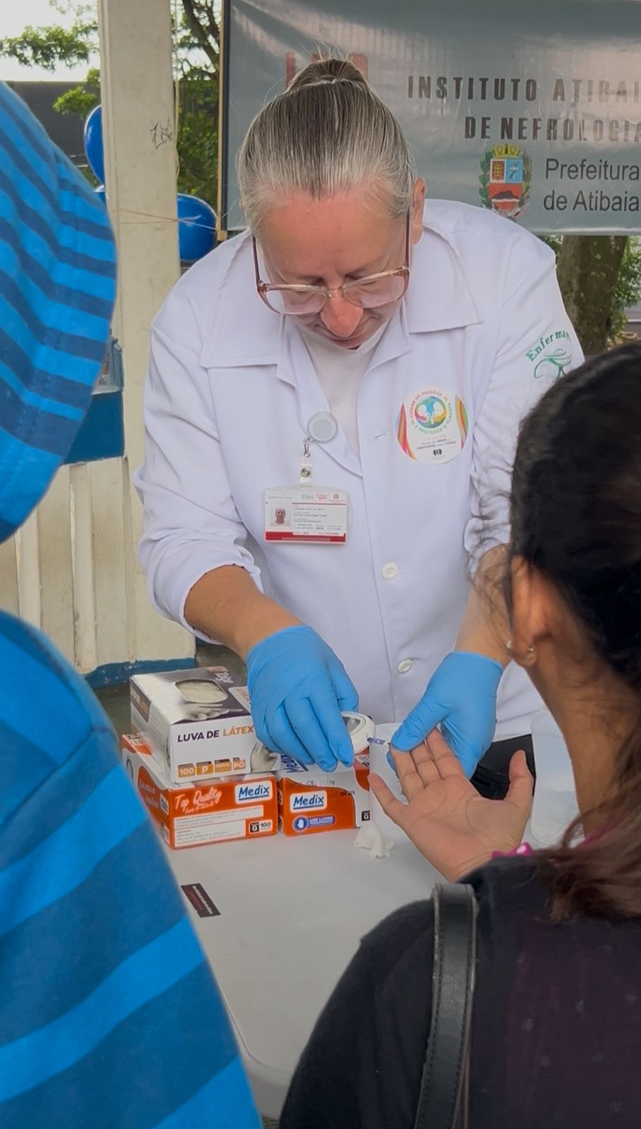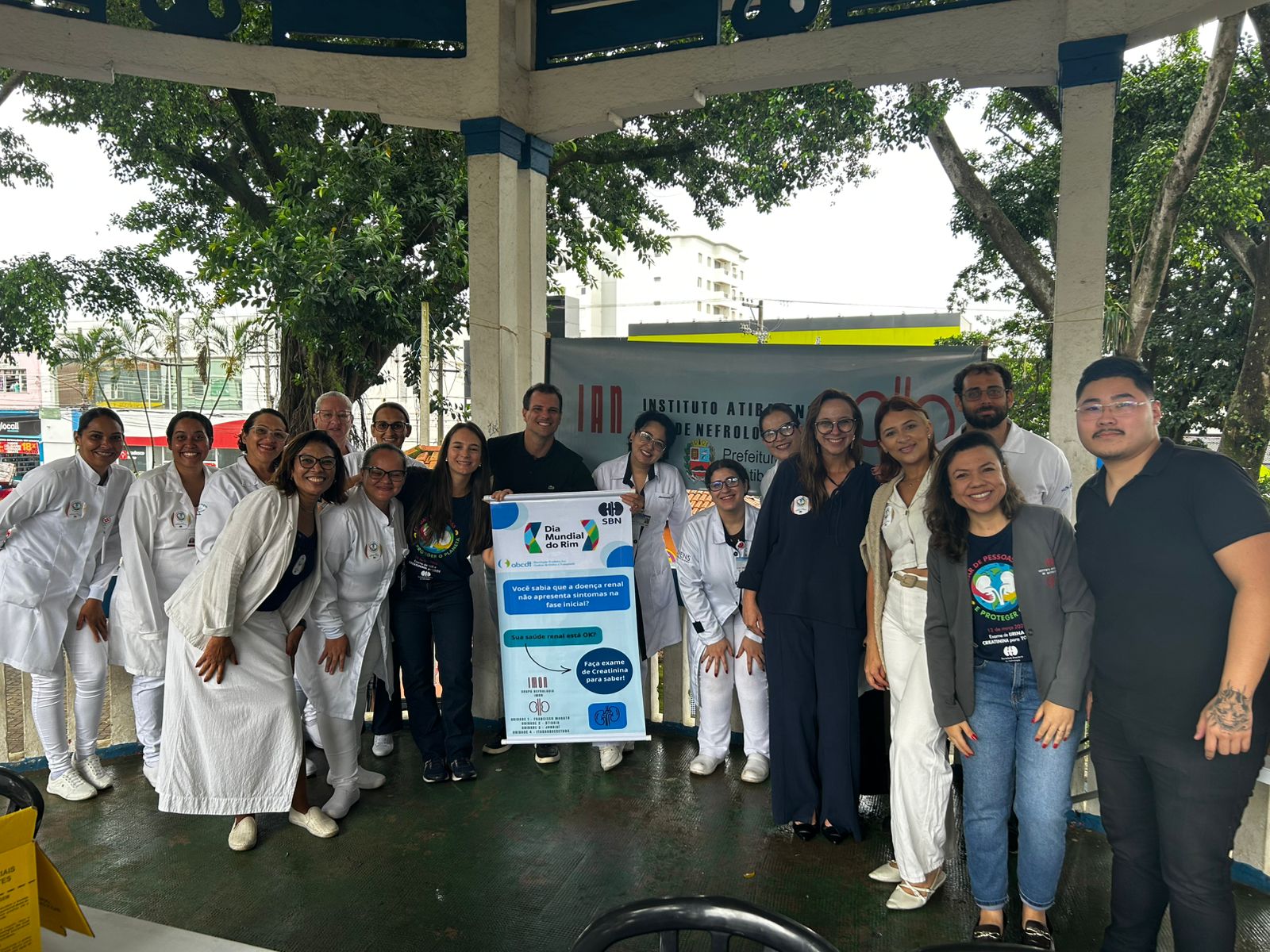 Atendemos mais de 100 pessoas na praça central de Atibaia, na qual realizamos teste de glicemia capilar, verificação de pressão arterial, informações sobre saúde renal e distribuição de garrafas de água.