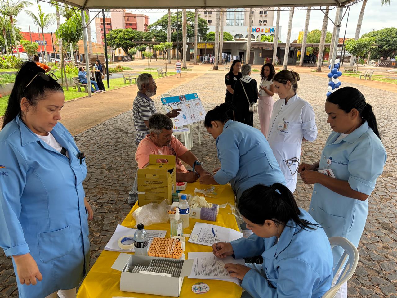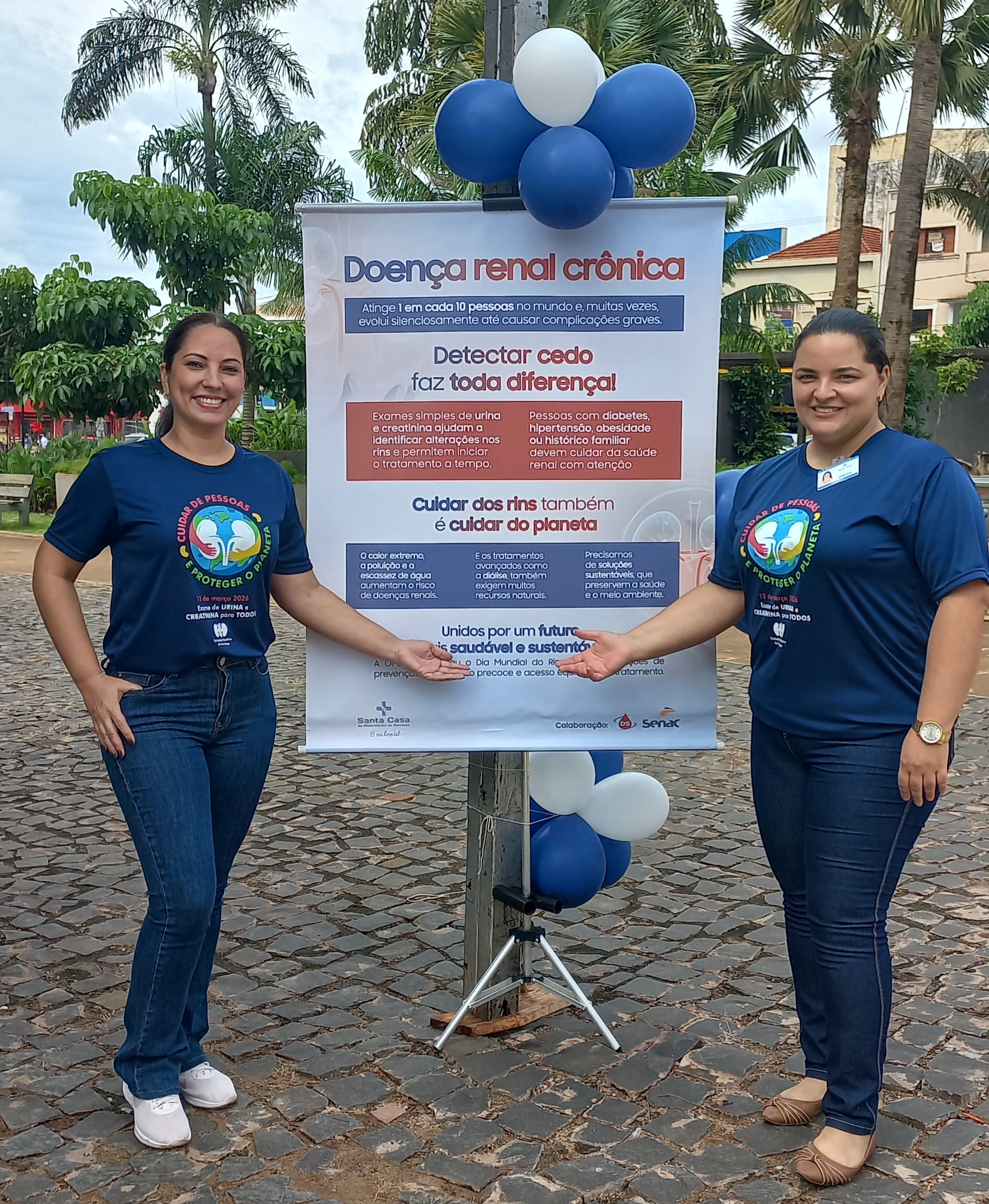 O evento ocorreu no dia 12/03/26 na praça central da cidade, participaram do evento a equipe de nefrologia da Santa Casa de Misericórdia de Barretos composta por médicos, técnicos de enfermagem , enfermeiros, nutricionista e psicóloga, teve a participação dos alunos do curso técnico de enfermagem da escola Senac, e também colaboração do laboratório DS, foi realizado orientação nutricional, aferição de pressão arterial, teste de glicemia, e coleta de creatinina para grupo de risco como: hipertensos e diabéticos, após resultado dos exames que ficaram prontos em 40 minutos, os médicos nefrologistas já passavam o resultado e realizavam orientações. Foram realizados 78 atendimentos, 43 coletas de exame de creatinina e 3 encaminhamentos para nefrologia.