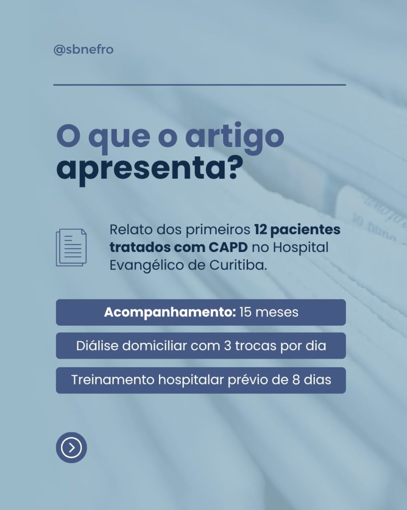 O estudo, conduzido por Miguel C. Riella e colaboradores, descreveu os resultados dos primeiros 12 pacientes tratados com CAPD no Hospital Evangélico de Curitiba, marcando o início da diálise domiciliar no Brasil.