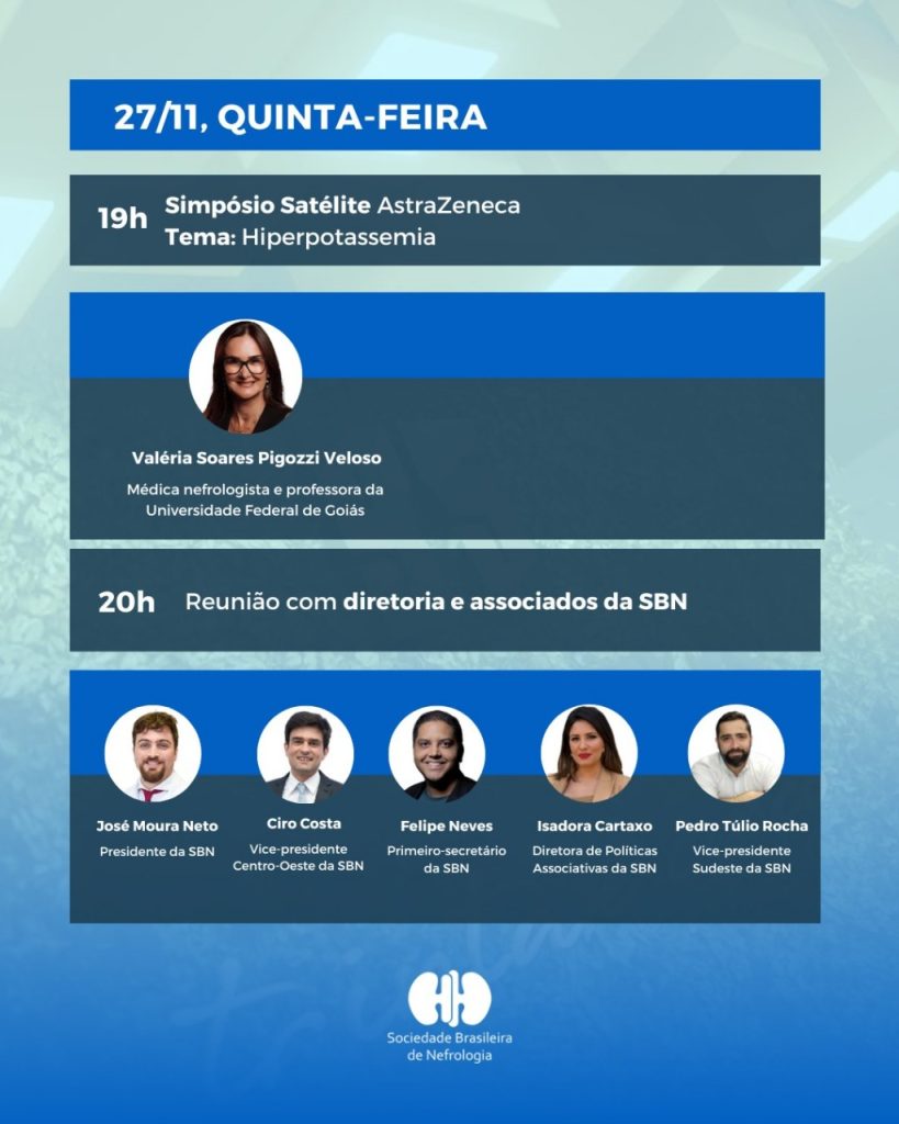 No dia 27.11, às 19h, acontece o Simpósio Satélite sobre ”Hiperpotassemia”, em seguida, às 20h, haverá um encontro exclusivo da Diretoria Nacional da SBN com os associados de Goiânia para acolhimento de propostas e debate.
