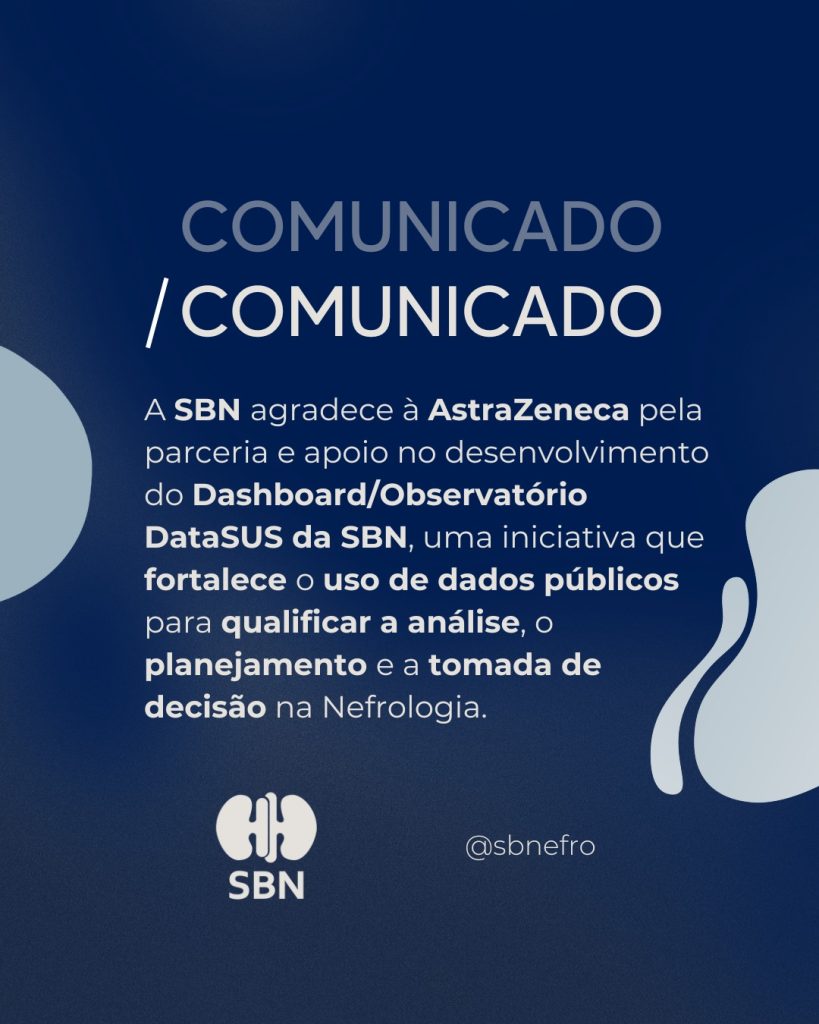 A Sociedade Brasileira de Nefrologia (SBN) agradece à AstraZeneca pela parceria e apoio no desenvolvimento do Dashboard / Observatório DataSUS da SBN, uma iniciativa estratégica que fortalece o uso de dados públicos para qualificar a análise, o planejamento e a tomada de decisão na Nefrologia.