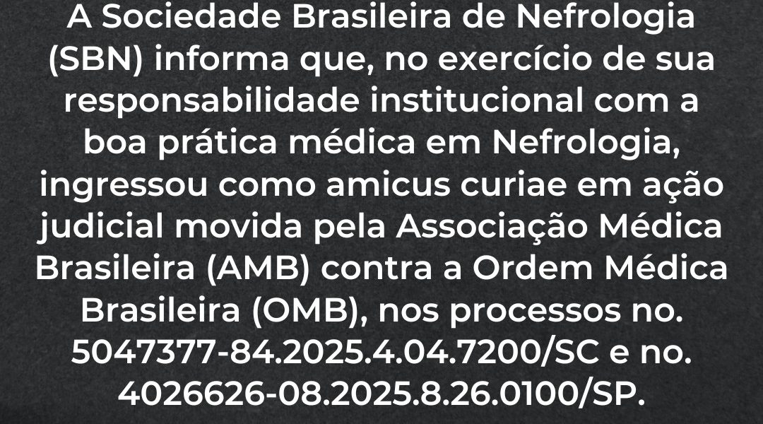 Prezados(as) nefrologistas, A Sociedade Brasileira de Nefrologia (SBN) informa que, no exercício de sua responsabilidade institucional com a boa prática médica em Nefrologia, ingressou como amicus curiae em ação judicial movida pela Associação Médica Brasileira (AMB) contra a Ordem Médica Brasileira (OMB), nos processos no. 5047377-84.2025.4.04.7200/SC e no. 4026626-08.2025.8.26.0100/SP. Desde o início, a SBN vem apoiando as medidas adotadas pela