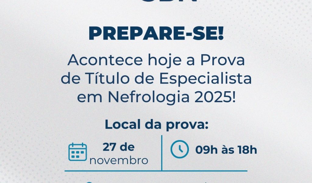 Participe da Prova de Título de Especialista em Nefrologia 2025 – modalidades Adulto e Pediatria. ⚠ Prazo: até 30/09 para realizar sua inscrição em sbn.org.br/medicos/prova-de-titulo-de-especialista-2025/. 🗓 Data da prova: 27 de novembro de 2025 🕘 Horário: 9h às 18h 📍 Local: Hotel K – Av. Jamel Cecílio, 2550, Jardim Goiás, Goiânia/GO